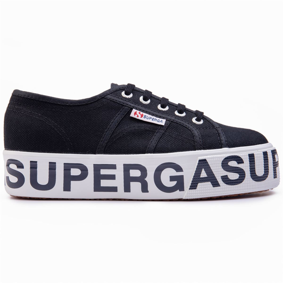 Dillo con una sneaker! Il maxi lettering Superga firma lo stile distintivo di questo modello con zeppa alta 4 cm. La tomaia in tela di cotone estremamente resistente e traspirante, la linea leggera con punta arrotondata e la suola in gomma vulcanizzata confermano l'estetica del modello che si adatta a ogni passo. Classica label con logo jacquard bicolor, interno foderato.