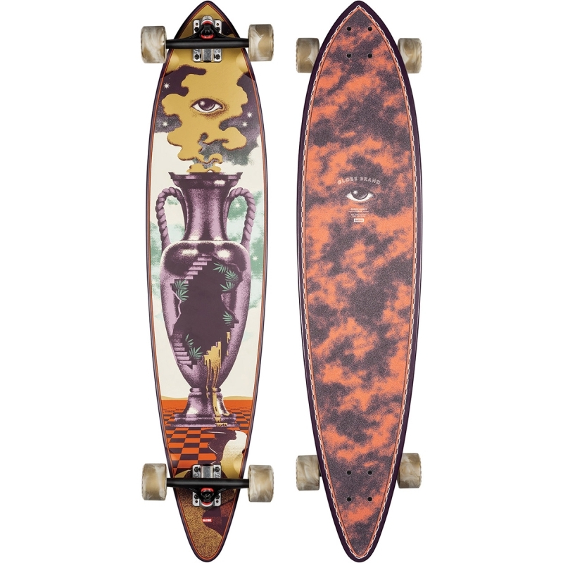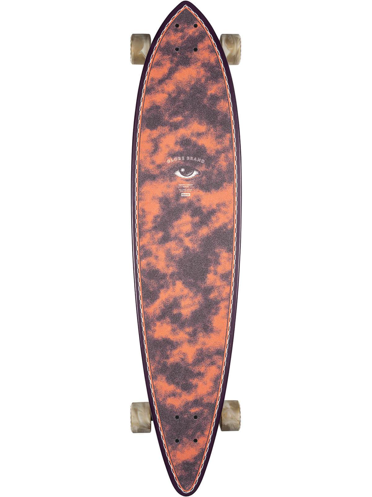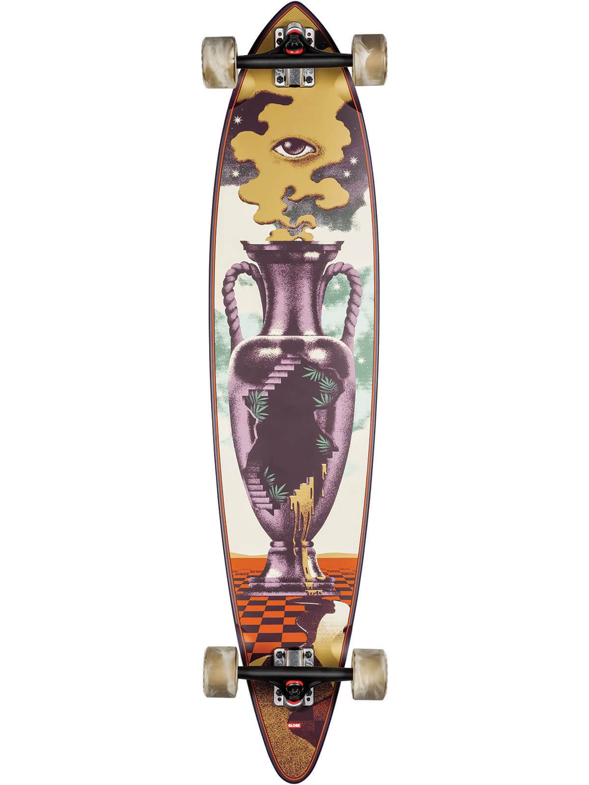 Artwork di Max Löffler su tavola e grip. Il Globe Pintail 44 in The Outpost è un longboard pintail lungo e flessibile realizzato in acero Resin-7 hard rock.