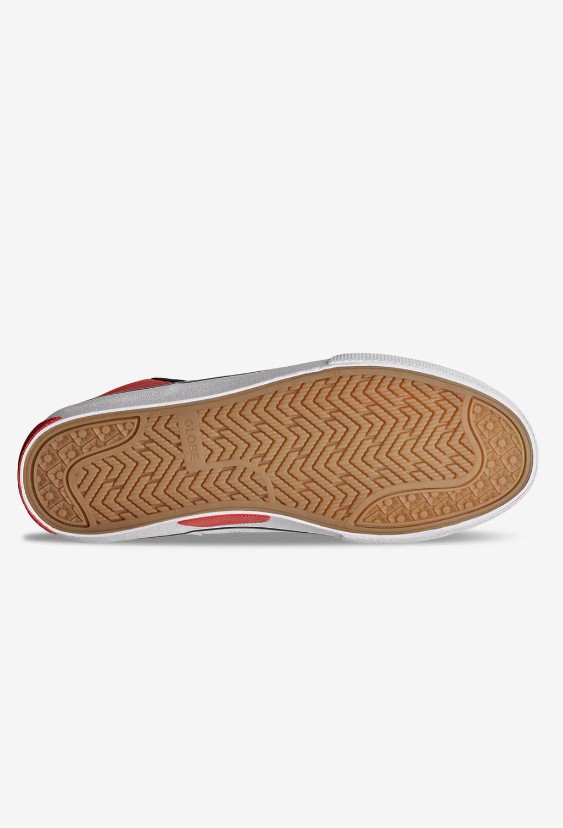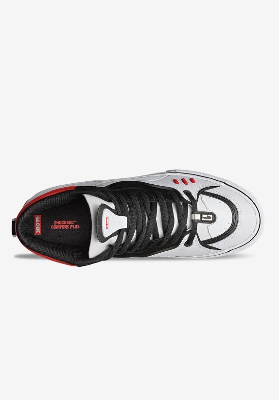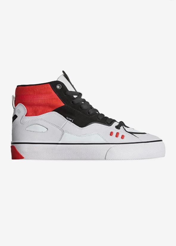 Esteticamente ispirata al DNA dei nostri classici del passato, con un'attenzione moderna alla funzione e alla durata di skateboard , questa scarpa alta vulcanizzata a strati è stata progettata esclusivamente per lo skateboard. Costruita per durare nel tempo con la protezione ollie multi stratificata e supportata da gomma. GlobeLa soletta Shockbed™ per il controllo degli impatti e la suola Super-V™ per una maggiore aderenza e sensazione sulla tavola. Il modello Globe Dimension in Bianco/Nero/Rosso è composto da pelle scamosciata, tela e pelle sintetica.