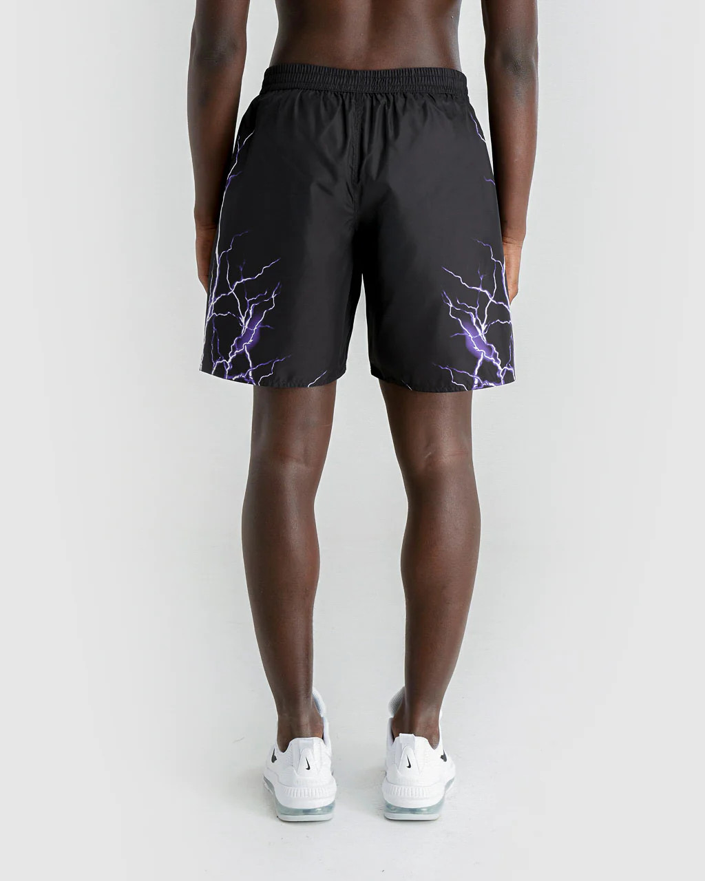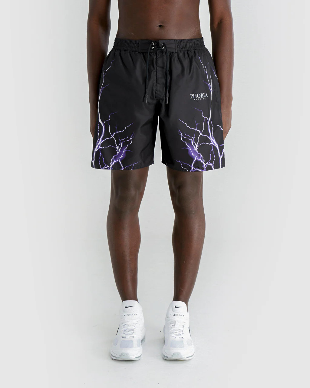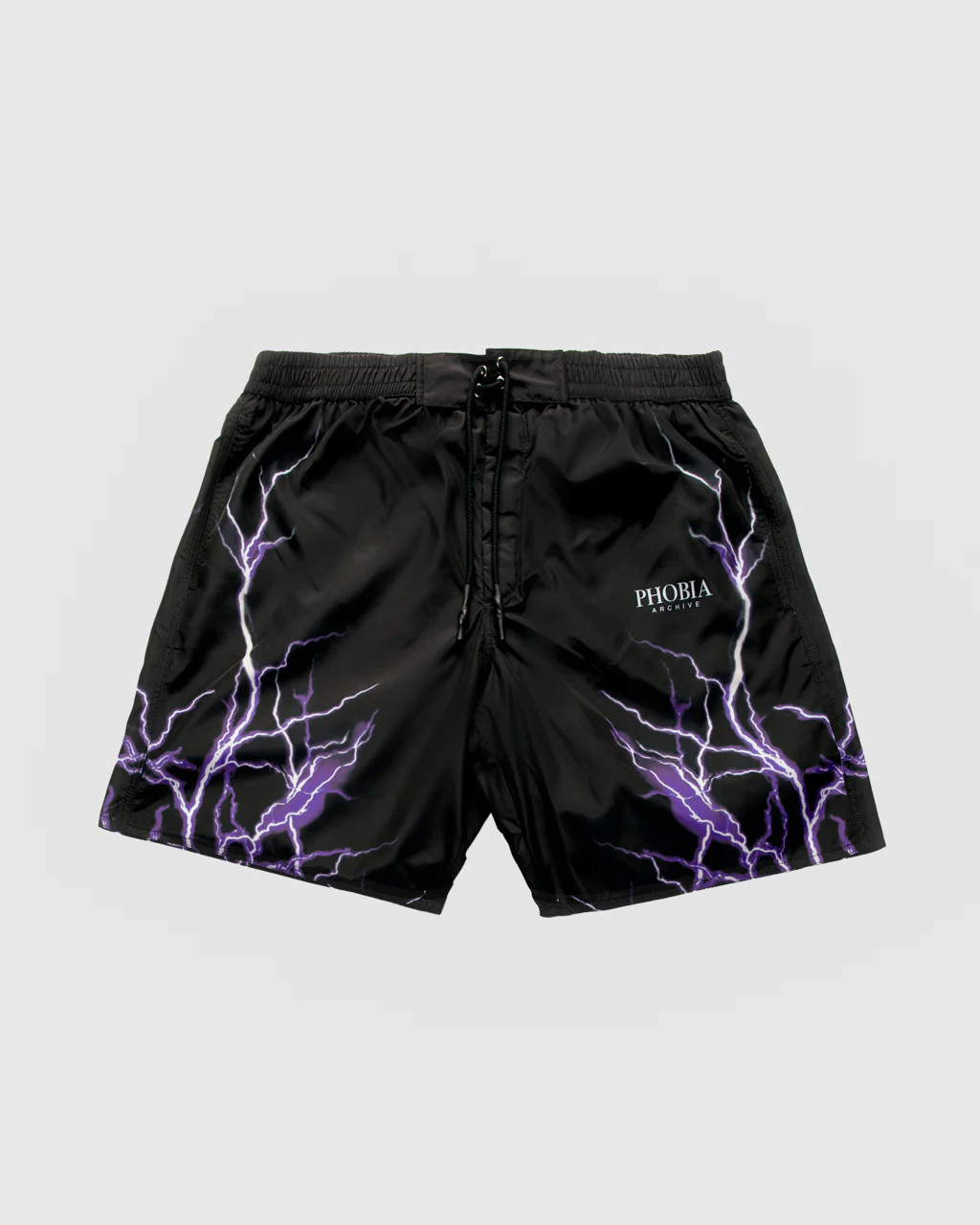 Costume Phobia Archive neri con grafica Lightning in stampa serigrafica viola e grigia su entrambe le gambe.