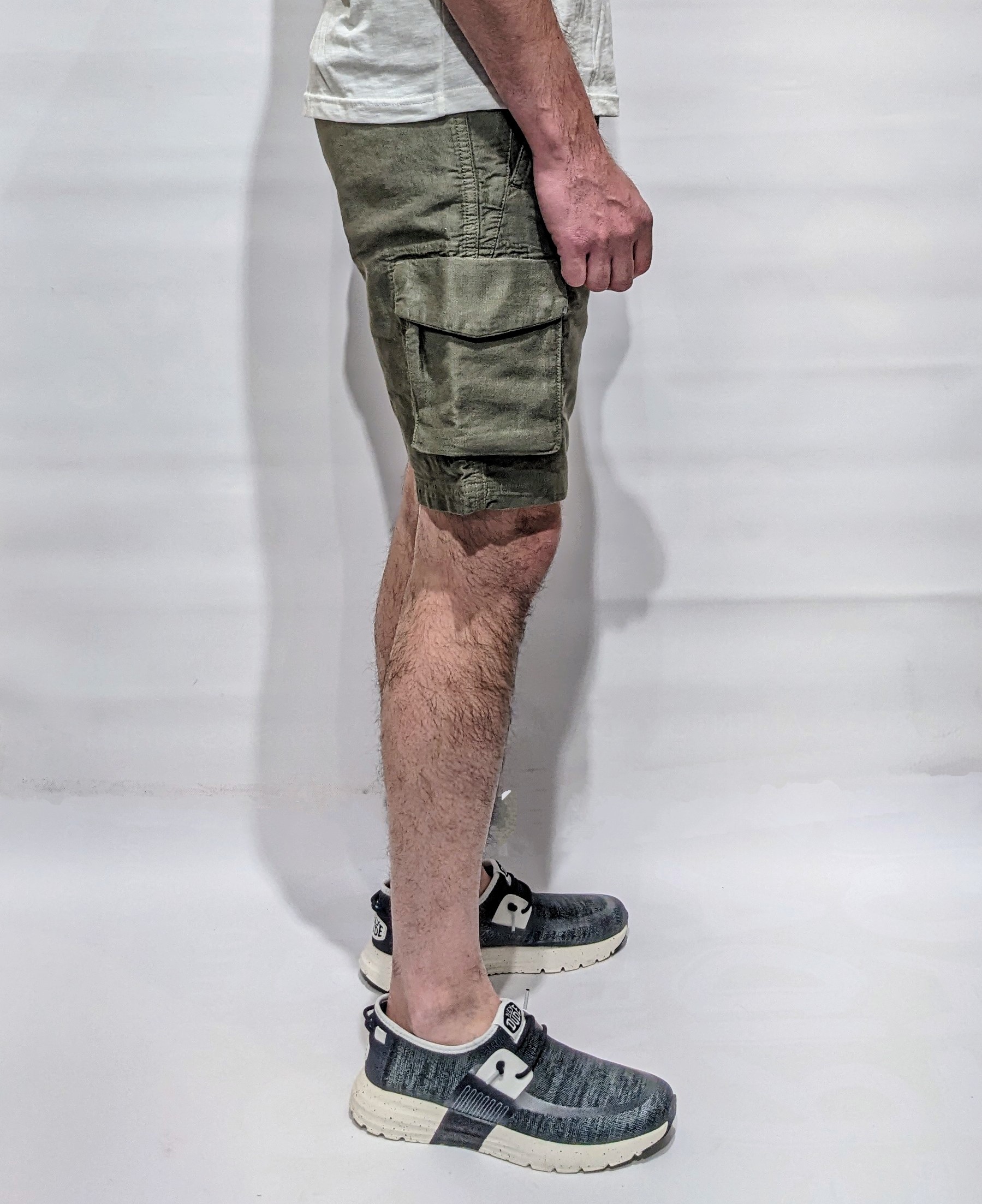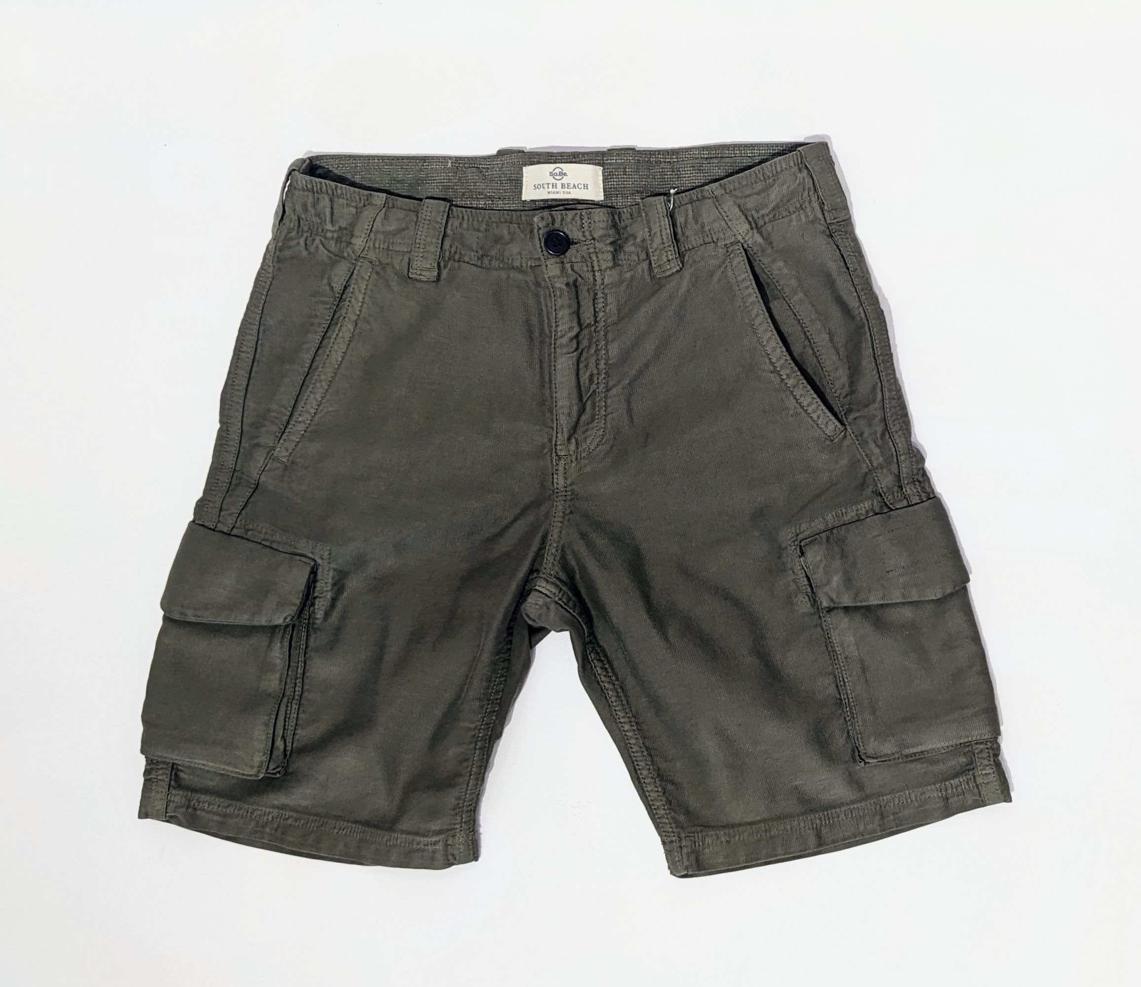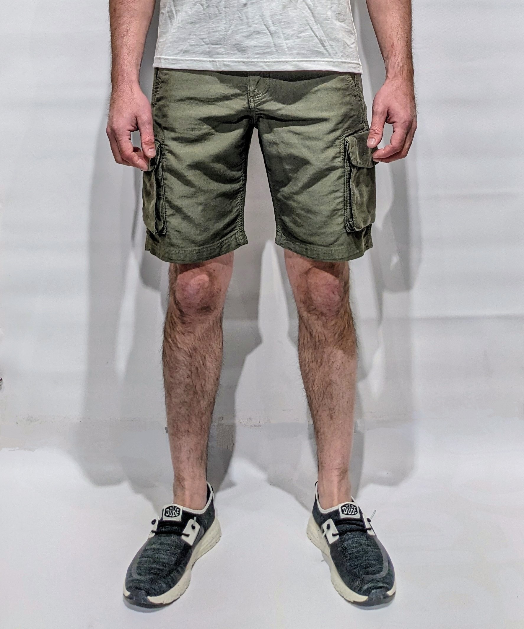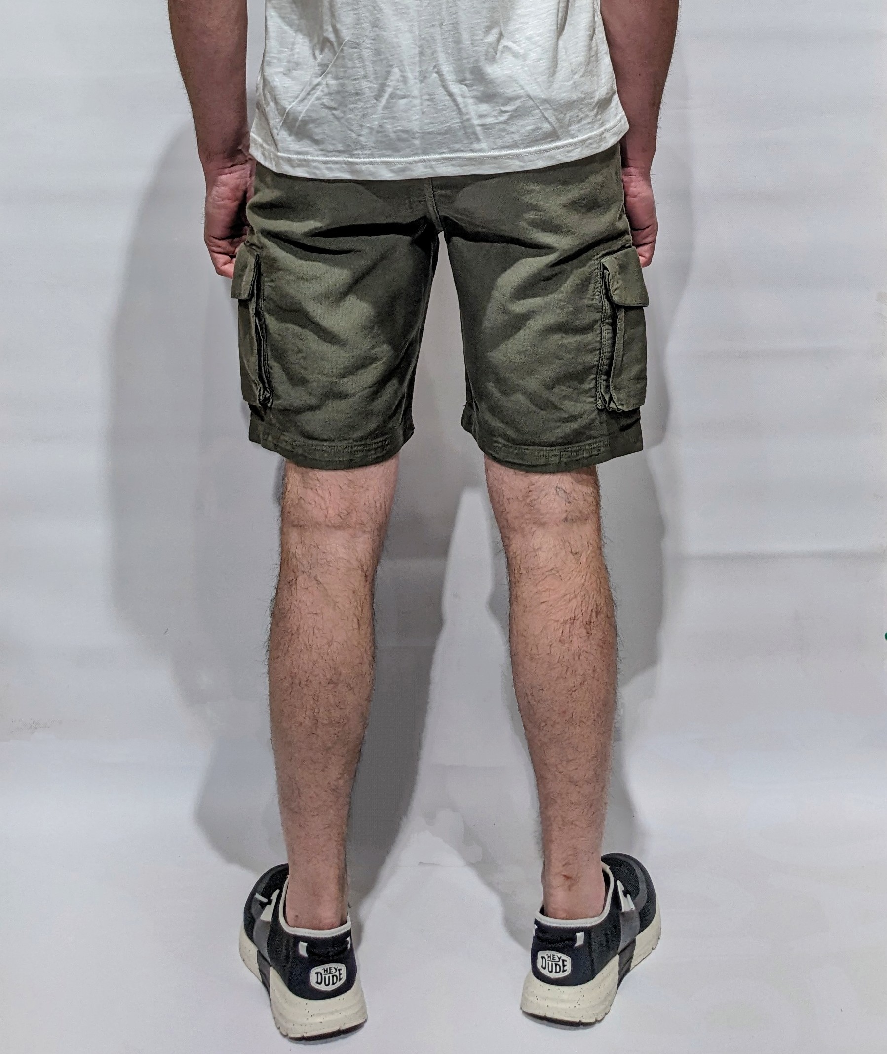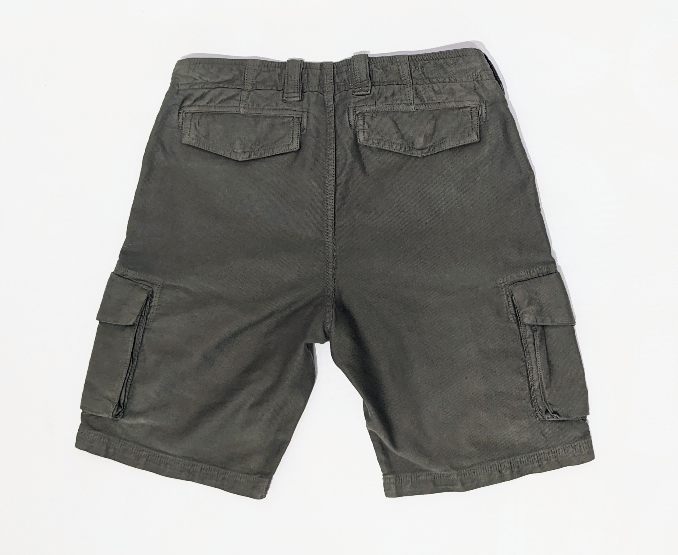 Pantaloni bermuda color verde in cotone elasticizzato con due profonde tasche cargo, volume lungo le cosce e altre due tasche a filetto con pattina posteriori.