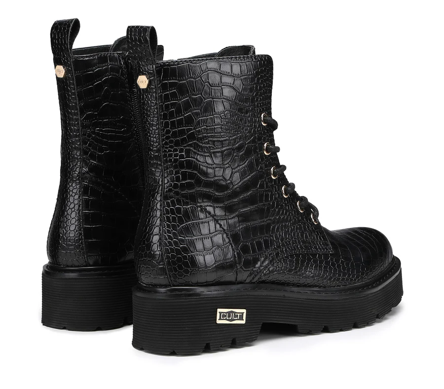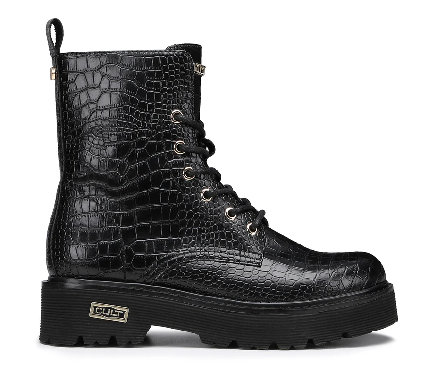 Comodi ma senza rinunciare all'anima rock gli anfibi stringati firmati da Cult per questo inverno. Un modello intramontabile di stivaletti in pelle, con occhielli in metallo color oro, targhetta con logo sulla suola di gomma e tirante posteriore. Da indossare con jeans, pantaloni o gonne corte.