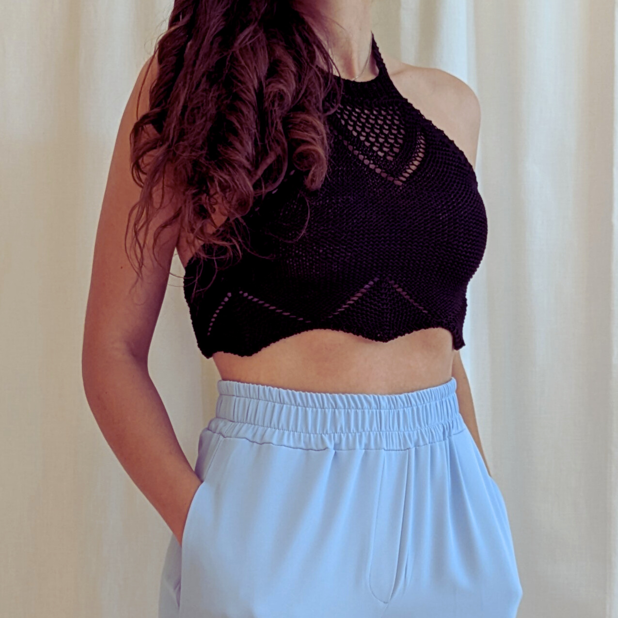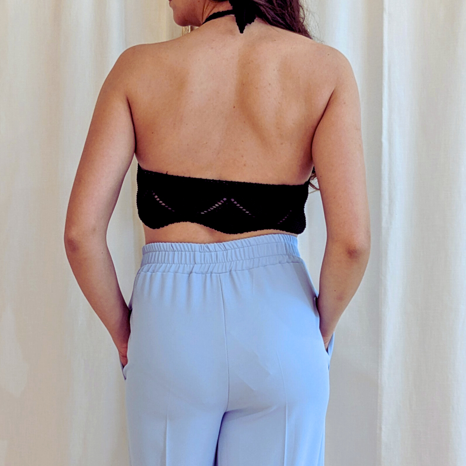 Questo elegante top all'uncinetto è un capolavoro, caratterizzato da dettagli intricati e un design raffinato, presenta un motivo molto lavorato con motivi delicati e pattern complessi che creano un effetto di grande raffinatezza. La parte superiore è legata sul collo, lasciando la schiena leggermente scoperta e conferendo un tocco sensuale e femminile. Perfetto per occasioni speciali o per un look boho chic, questo top combina eleganza in un unico capo.