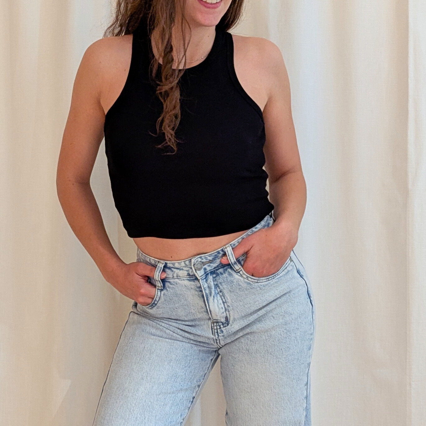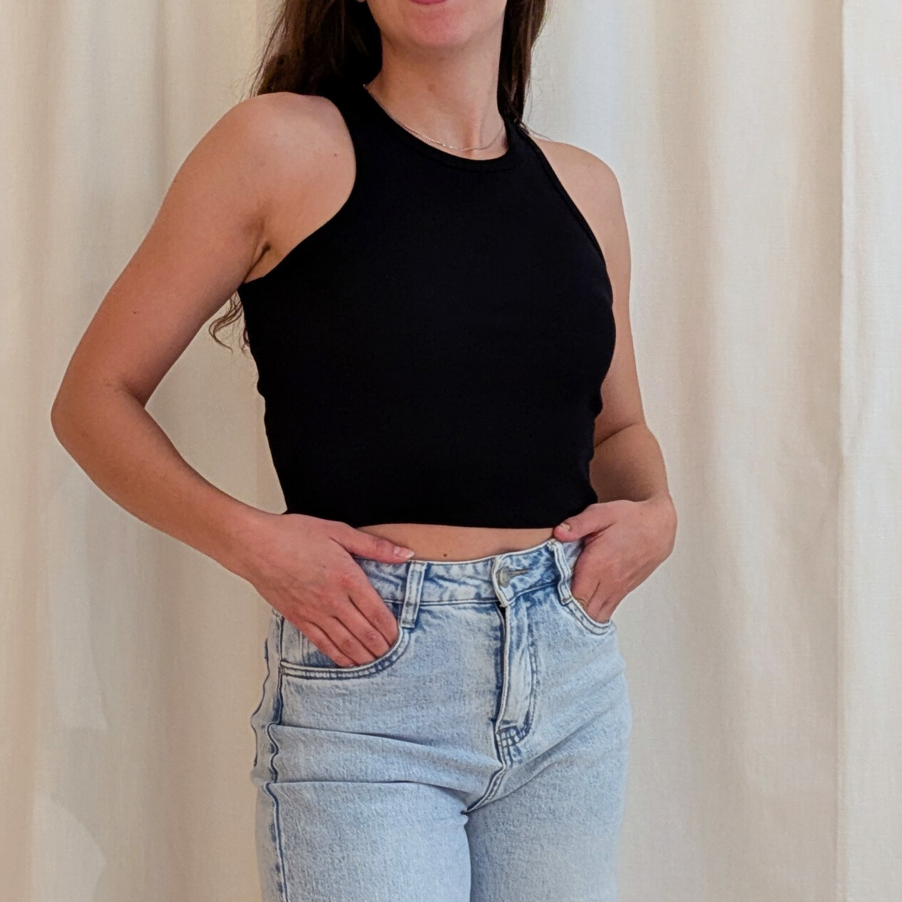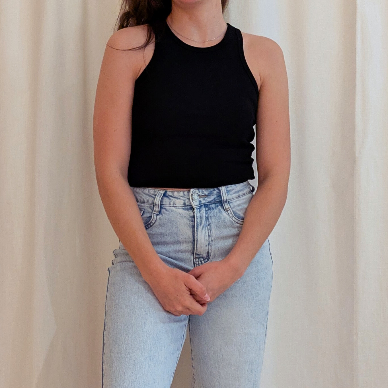 La canotta crop americana è un capo basico ma estremamente attuale, perfetto per creare outfit minimalisti, sportivi o casual chic con taglio smanicato, tipica della scollatura "americana", che lascia le spalle scoperte e valorizza braccia e schiena.