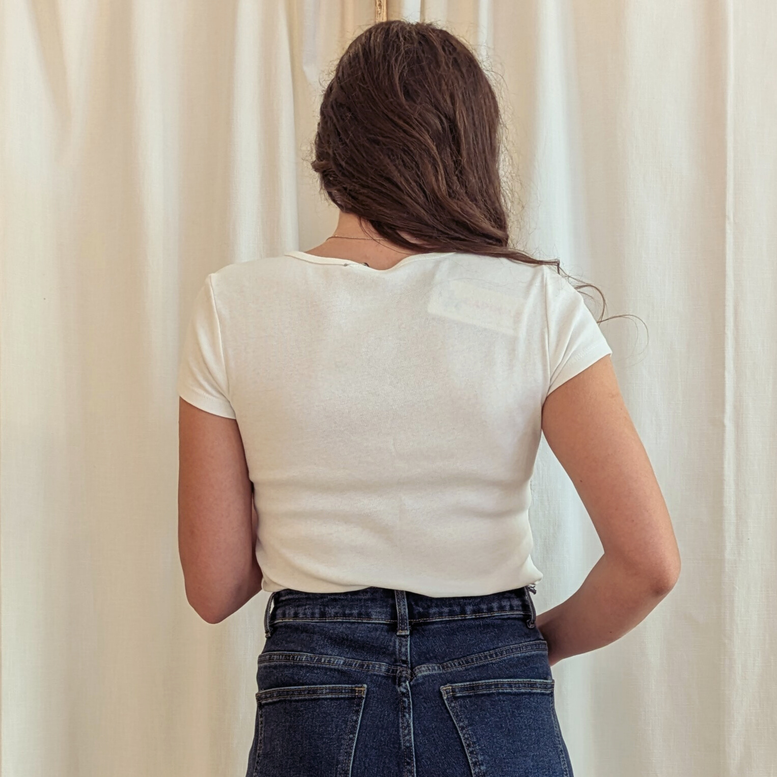 Femminile e divertente, questa t-shirt presenta un taglio sfiancato che valorizza la figura e una lunghezza media, ideale da indossare sia dentro che fuori dai pantaloni. Realizzata in morbido cotone, è impreziosita da un piccolo ricamo a forma di fragola all’altezza del seno, un dettaglio delicato e originale che aggiunge un tocco di personalità al look. Perfetta per completare outfit casual con un tocco fresco e giocoso.