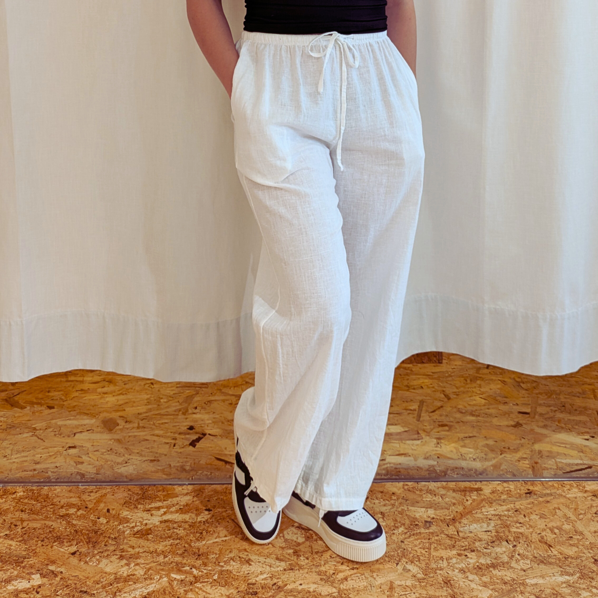 Il pantalone largo in lino bianco è un capo iconico dell’estate, sinonimo di eleganza rilassata e comfort naturale. Realizzato in lino leggero e traspirante, questo pantalone unisce freschezza e stile in una silhouette ampia e fluida, perfetta per affrontare le giornate più calde con raffinatezza.