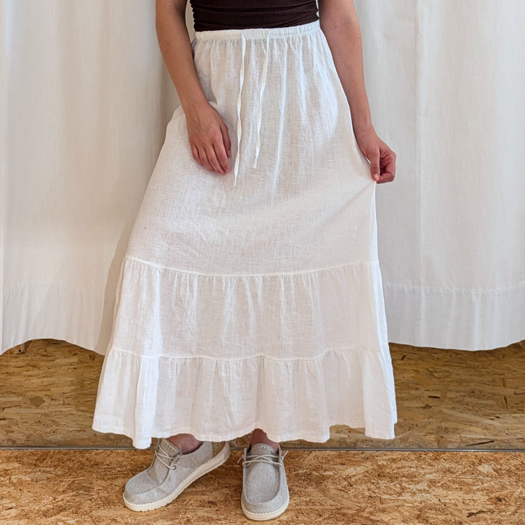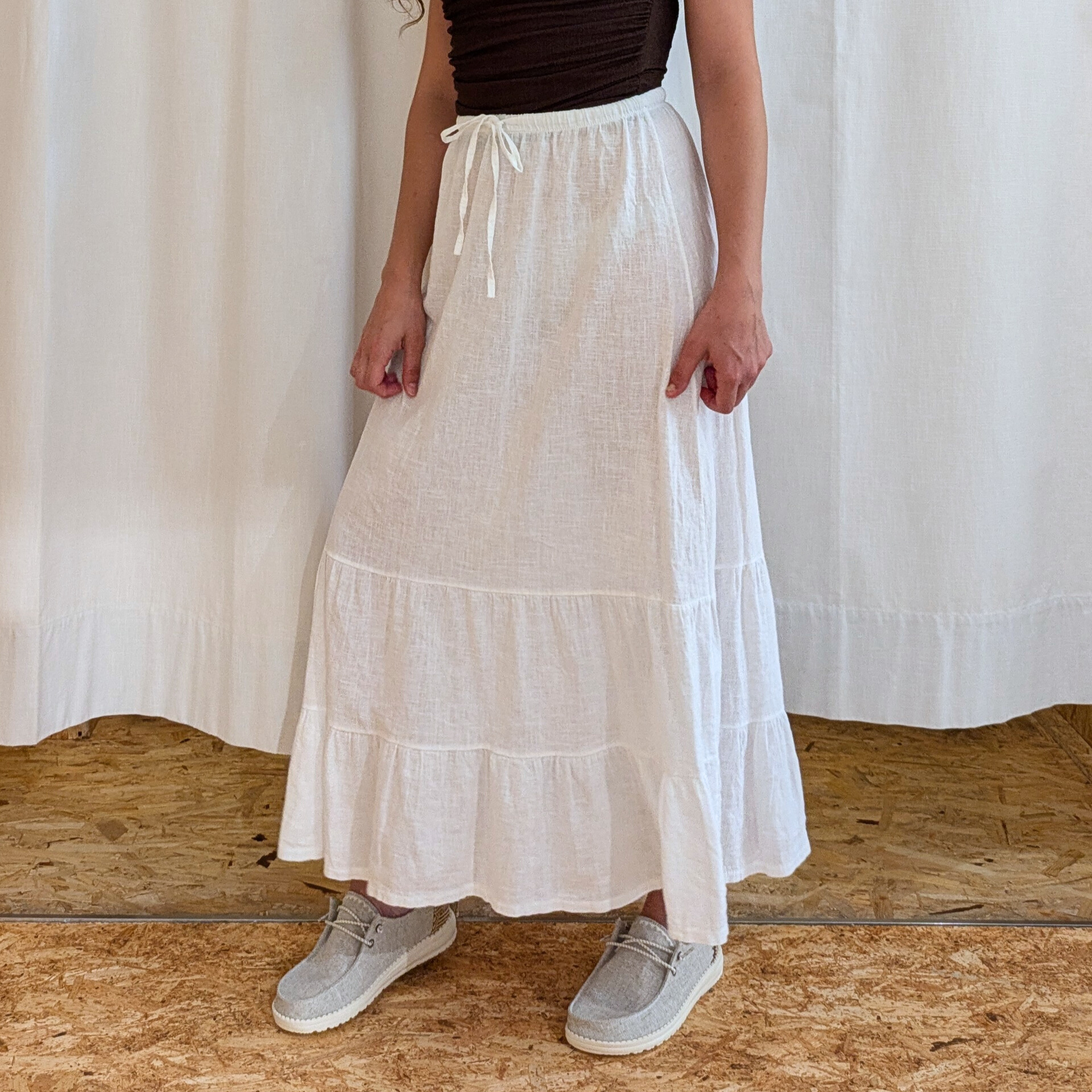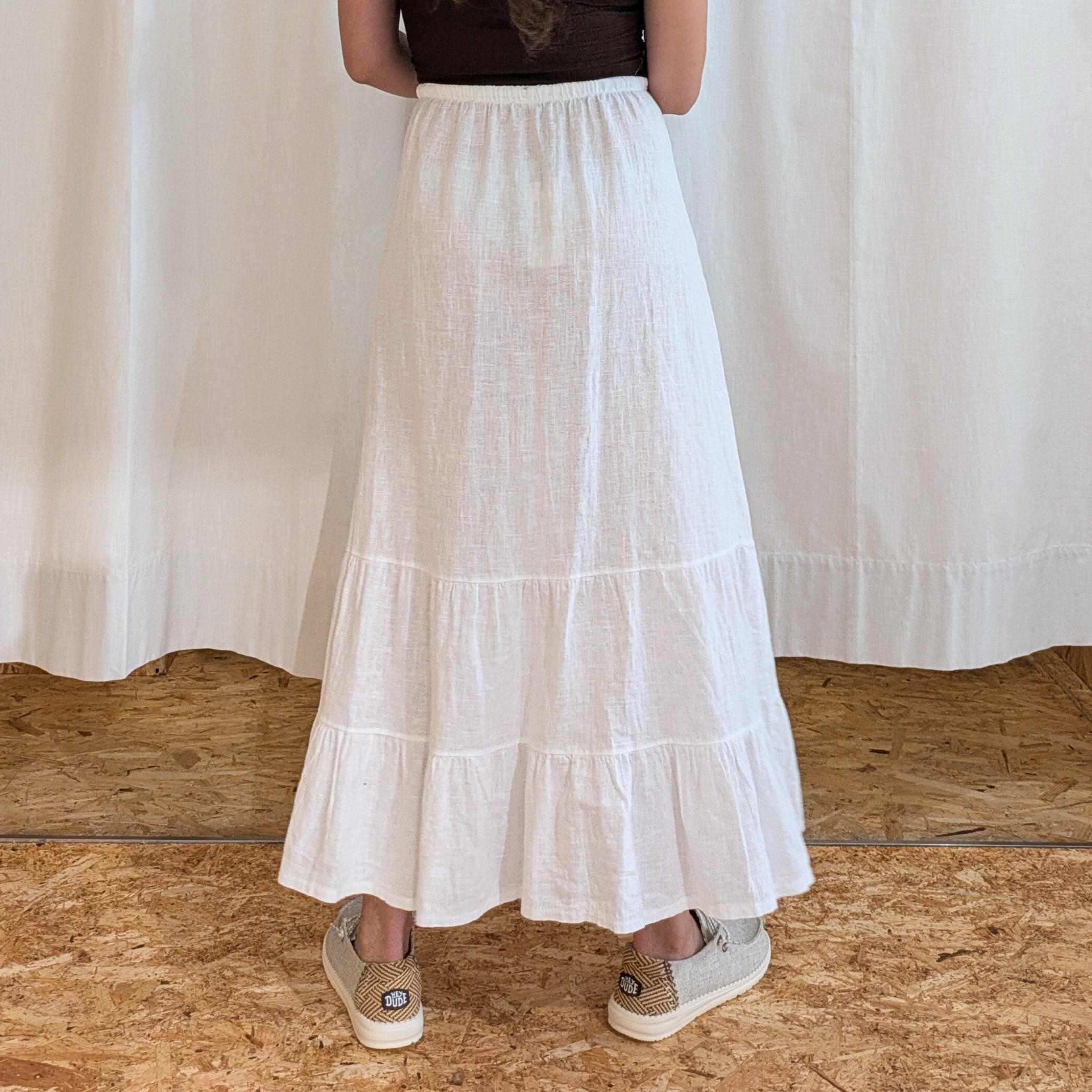 Fluida, romantica e senza tempo, questa gonna lunga con balze aggiunge movimento e personalità a ogni passo. Caratterizzata da una silhouette morbida e ariosa, è realizzata in un tessuto leggero che cade elegantemente lungo la figura. Le balze sovrapposte creano un effetto dinamico e femminile, perfetto per chi ama un look boho-chic o vuole aggiungere un tocco di grazia al proprio outfit.