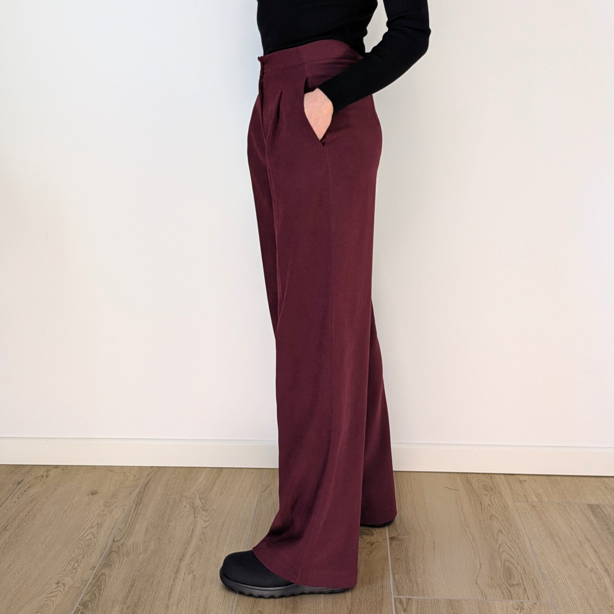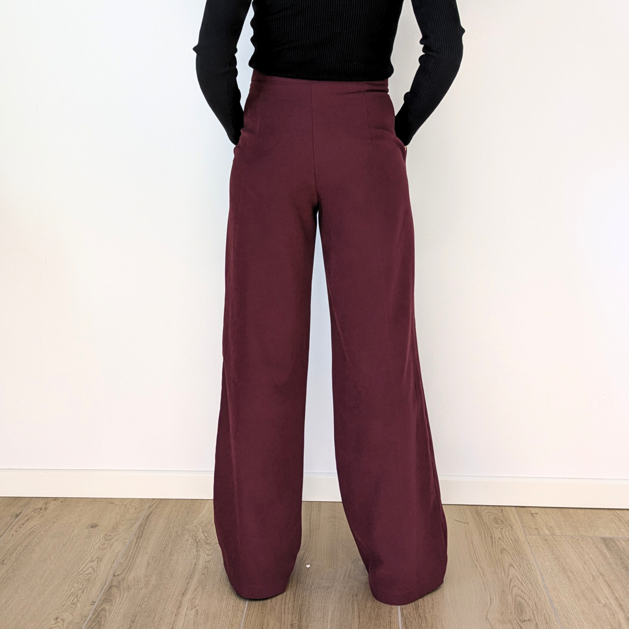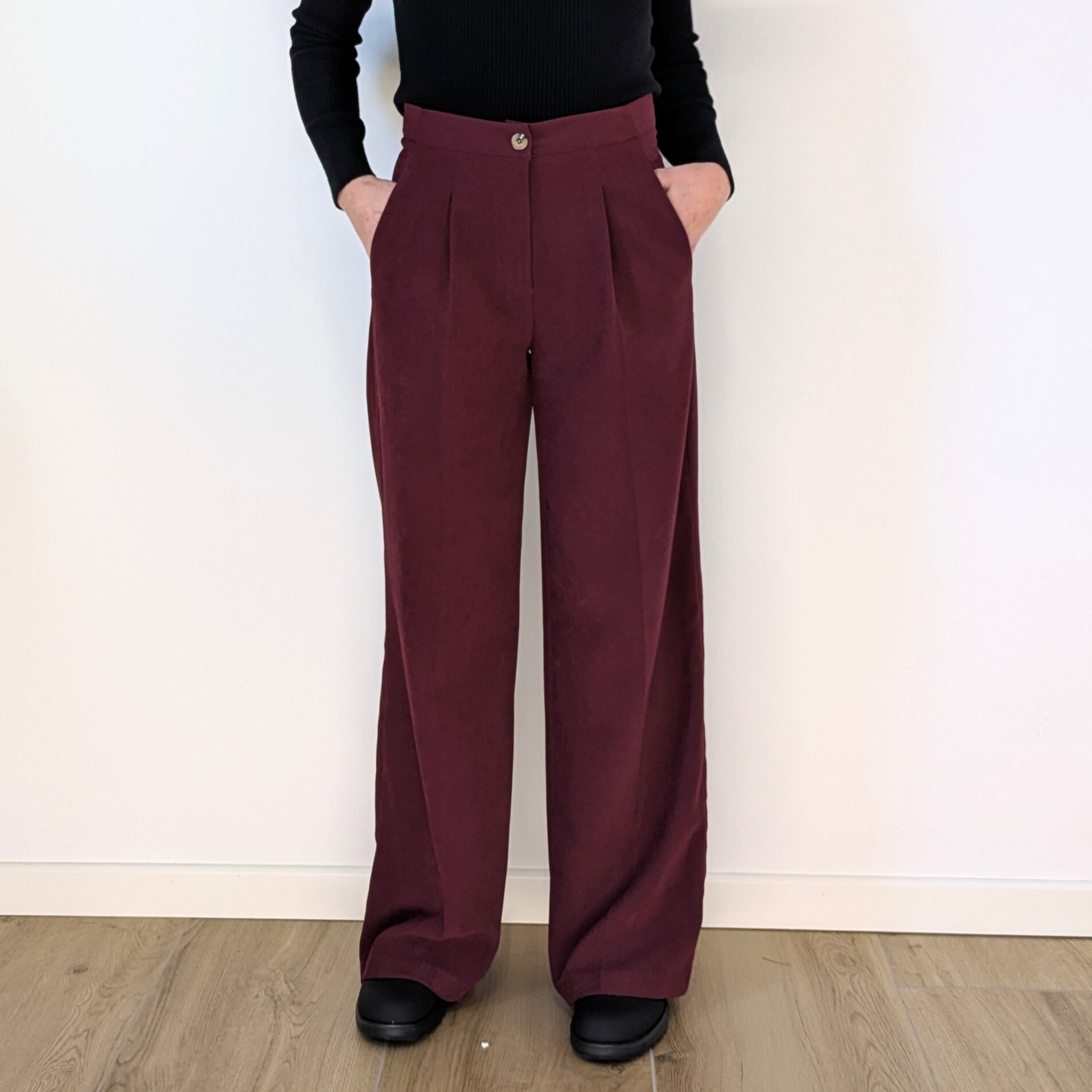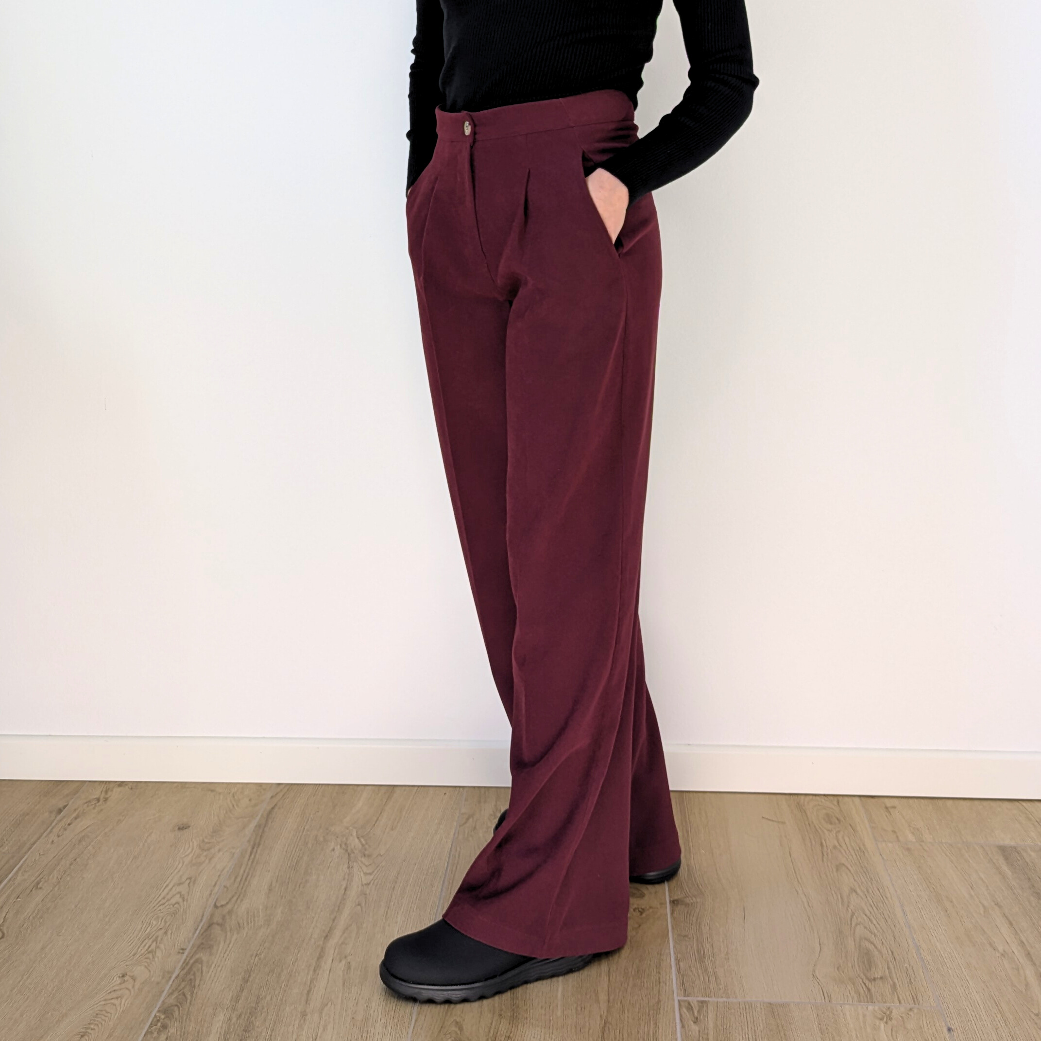 Il pantalone baggy in color bordeaux, ha la gamba che scende dritta e ampia, creando un effetto elegante e rilassato.