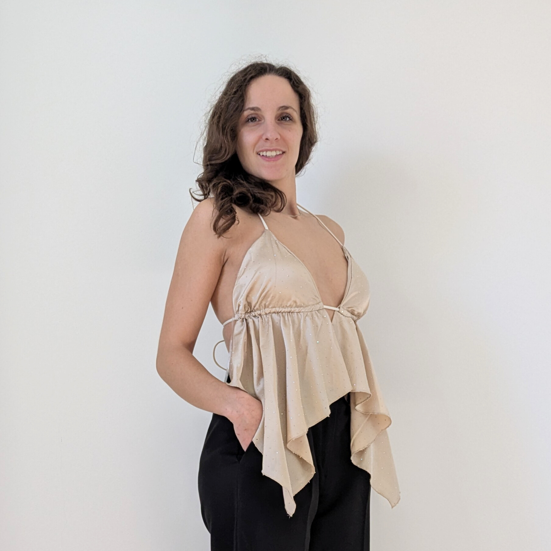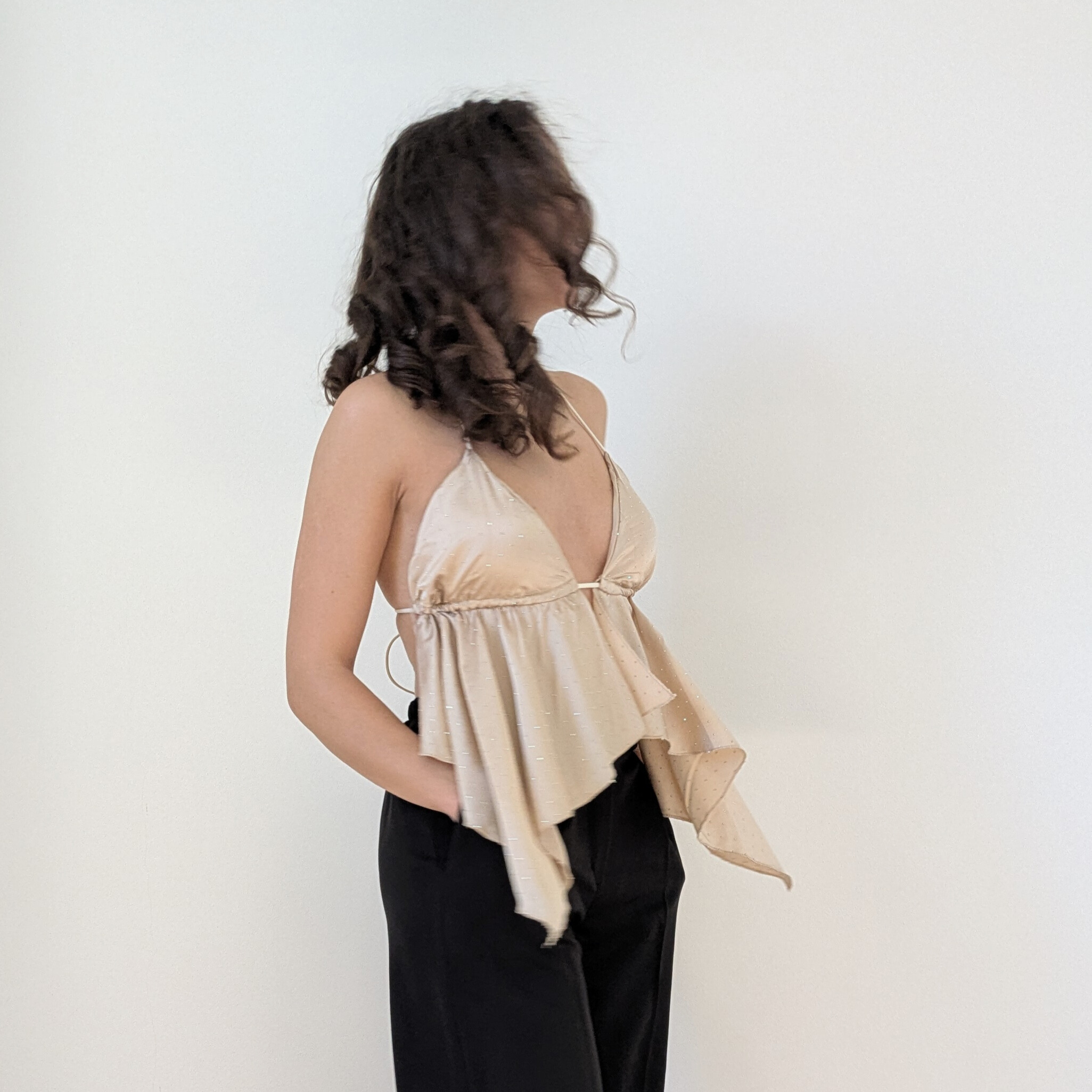 Un top luminoso e raffinato pensato per dare un tocco speciale a ogni outfit. Questo modello color champagne presenta una scollatura profonda con spalline sottili e un morbido taglio a cascata che dona movimento e femminilità.