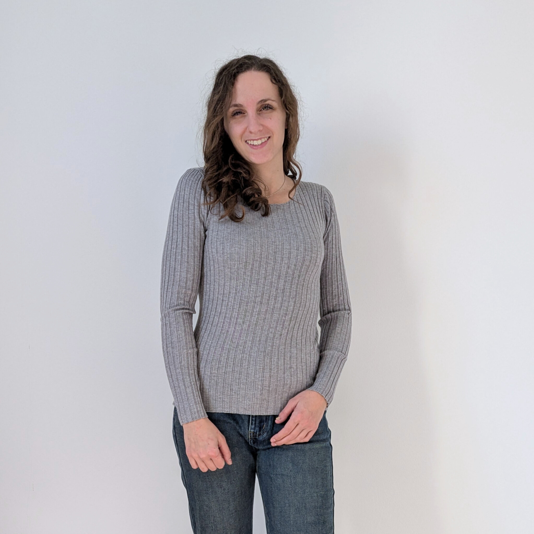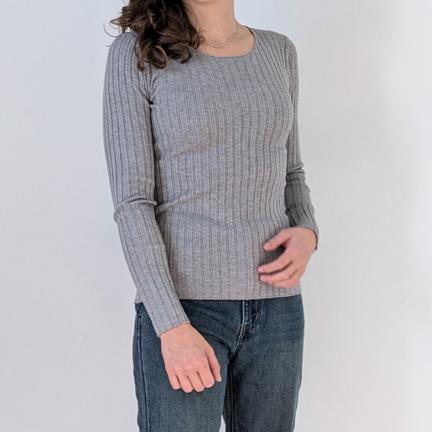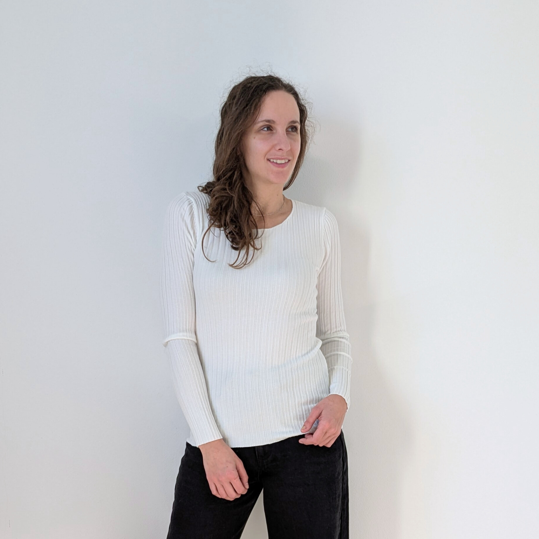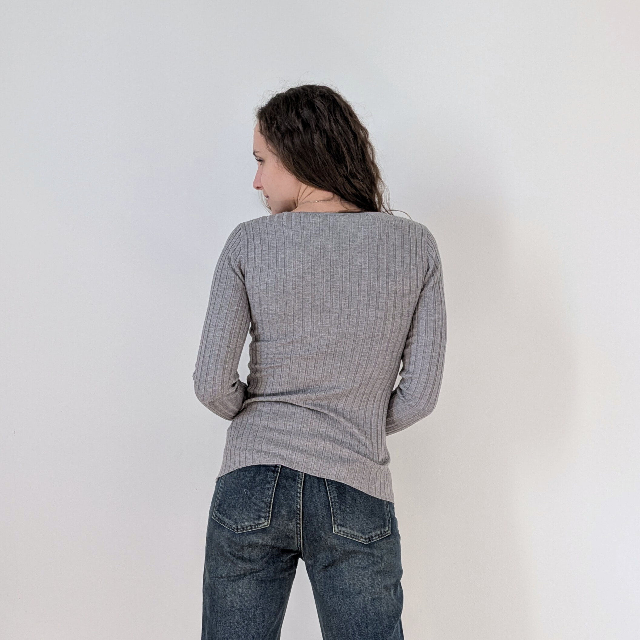La lavorazione a coste verticali accompagna delicatamente le forme del corpo, creando un effetto slanciante e femminile. Lo scollo ampio e arrotondato dona luminosità al décolleté e rende il capo elegante nella sua semplicità, perfetto sia da indossare da solo sia come base per look a strati.