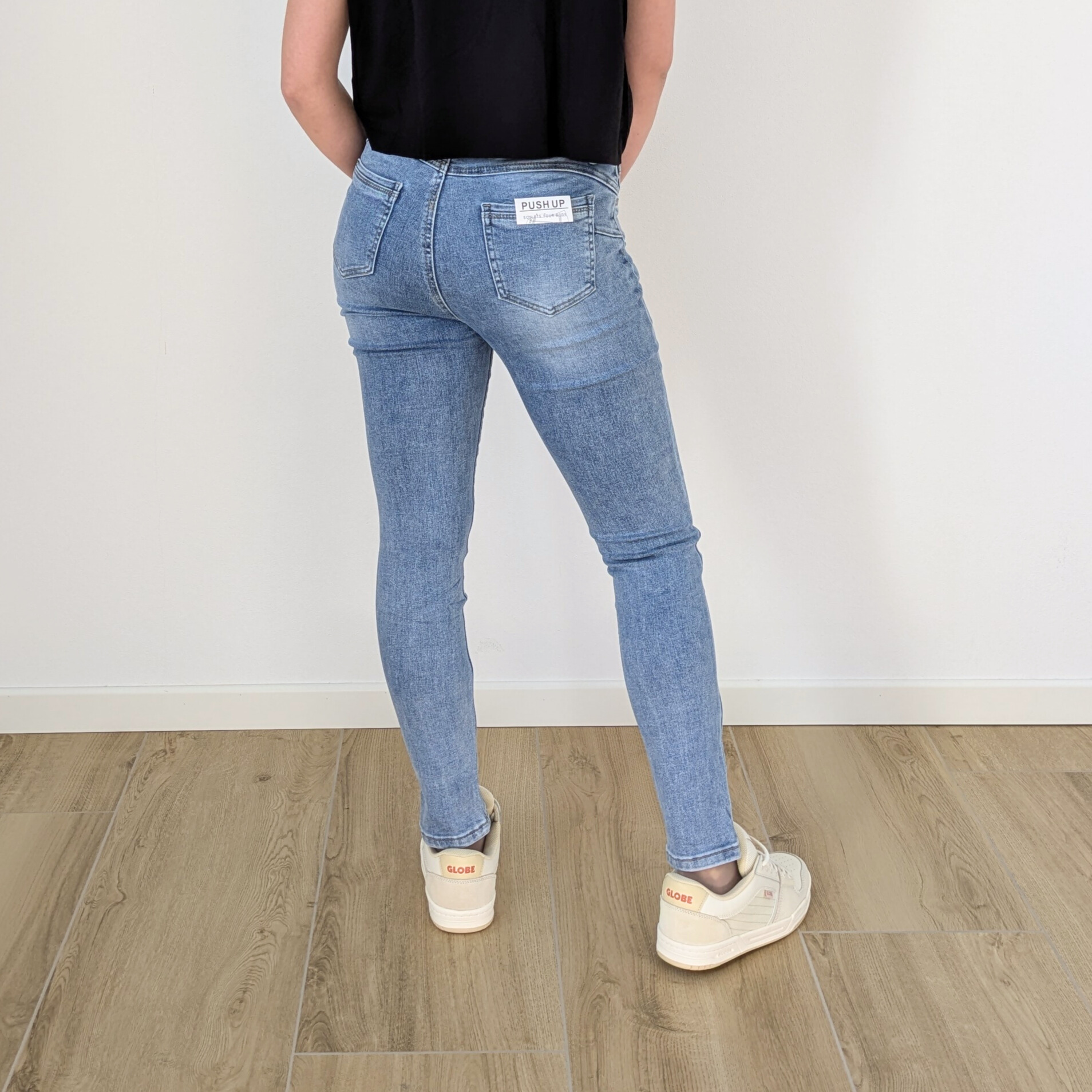 Jeans push up in denim lavaggio chiaro, progettati per valorizzare la silhouette e mettere in risalto le forme. La speciale costruzione con cuciture strategiche e tasche posteriori sagomate crea un naturale effetto push up, esaltando i glutei e slanciando la figura.