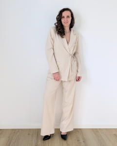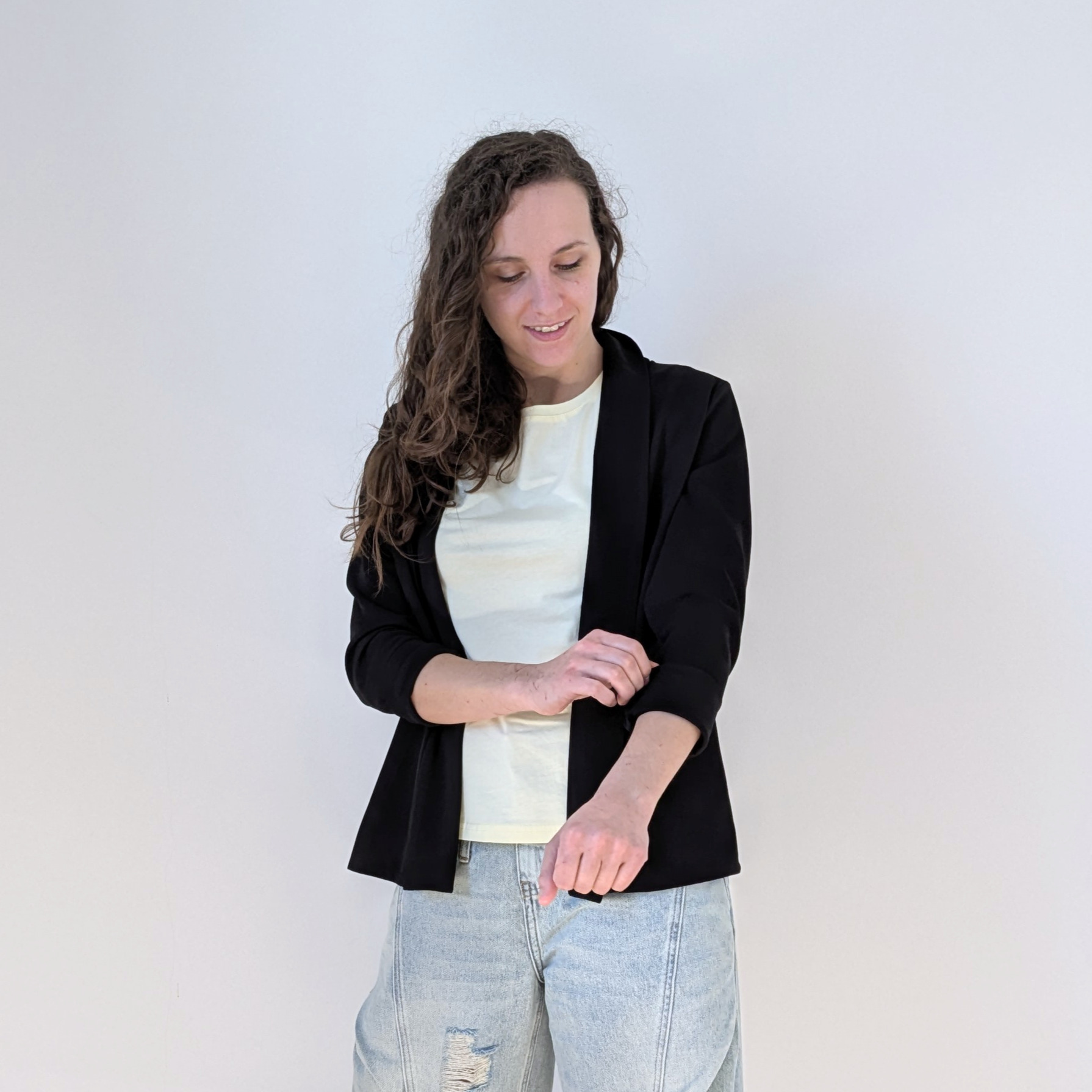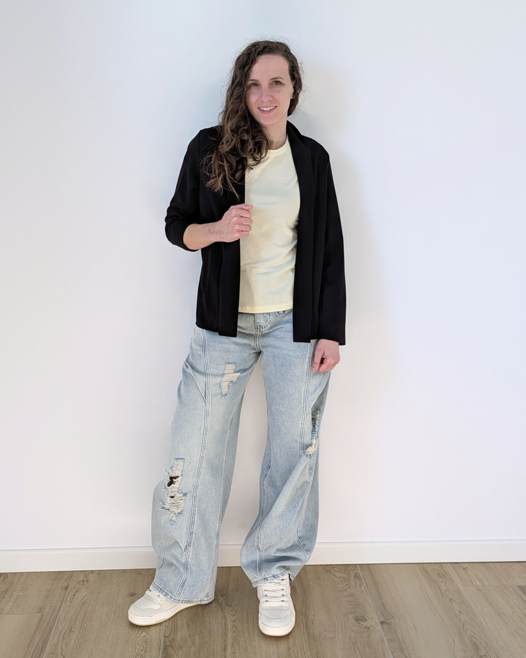 Abbinala a jeans e top basico per un look casual pulito, oppure a pantaloni sartoriali e blusa per un outfit più elegante.