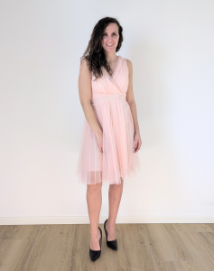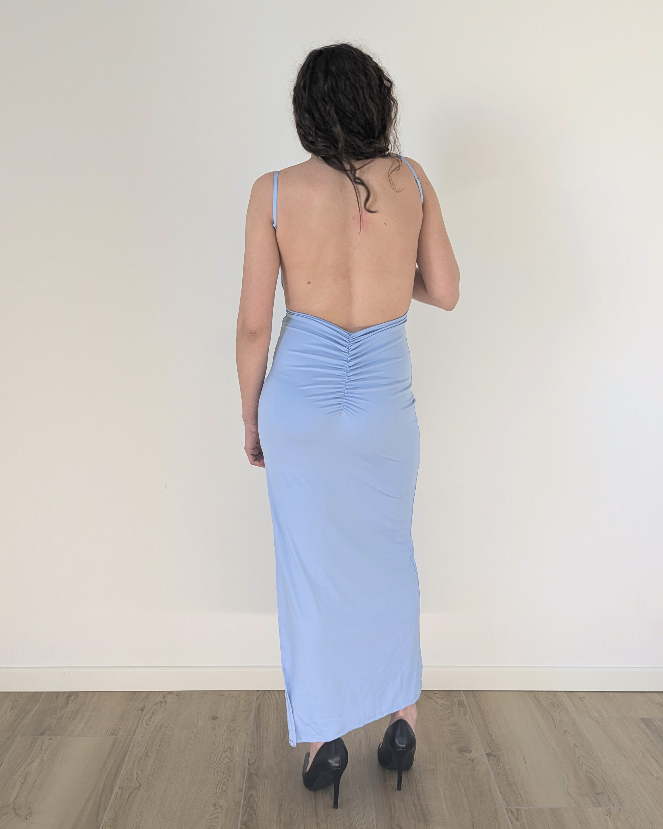 Il modello presenta sottili spalline e una schiena scoperta, per un effetto raffinato e femminile. Le coppe integrate offrono sostegno e definizione al décolleté, garantendo una linea impeccabile senza bisogno di ulteriori capi intimi.
